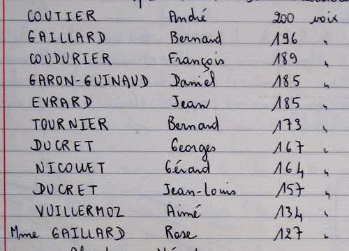 Dans l'ordre alphabétique, la liste des 11 conseillers est désormais : Coudurier François, Coutier André, Ducret Georges [7594], Ducret Jean-Louis [7647], Evrard Jean [7673], Gaillard Bernard [7627], Mme Gaillard Rose [Rose Salvi (née en Italie)], Garon-Guinaud Daniel [boulanger], Nicollet Gérard, Tournier Bernard, et Vuillermoz Aimé [7533].