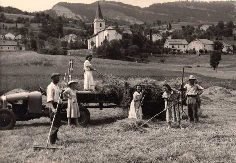Il n'y a pas si longtemps, on faisait encore les foins, non loin du centre du village. La photo ci-dessous (18 x 13 cm) a été prise le 8 juillet 1951 non loin de l'emplacement du garage Truche actuel.