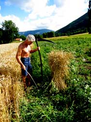 Remerciements à Claude Bonnin et son épouse (Confort) qui, bien que l'année 2010 fut pleine de promesse et se soit finalement révélée catastrophique pour la récolte du blé, ont accueillis le projet avec générosité et permis la prise des clichés, entre deux averses.... Merci aussi à Gilbert Blanc, qui avait gardé les éléments matériels nécessaires à la confection de ces liens ainsi que le savoir-faire du temps de son enfance, au service de cette reconstitution. Crédit photographique : G. Lancel (24 juillet 2010).