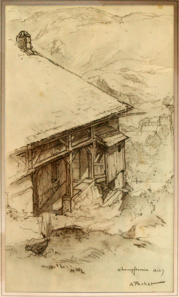 Cette sépia fut la première proposée au site parmi les tableaux réalisés à Champfromier (Ain) par le peintre Antoine Pochet. Elle fut reconnue à la suite de la publication dans ce site de la page sur la Maison Perrier.