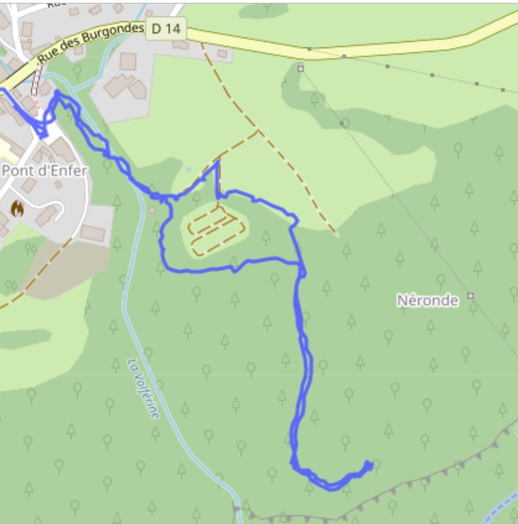 Traverser la Volferine à l'ancien pylône de la télémécanique. Prendre le sentier à droite après le mur des cibles.
