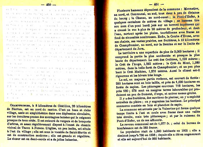 Concernant Champfromier on y relève une synthèse économico-géographique de plus d'une page. On pourra s'étonner de l'interprétation étymologique de Pont d'Enfer, associée à un torrent impétueux, sans référence aux faits historiques d'où il tire son nom. Signalons aussi la coquille du Crêt de l'Auge (lire Crêt de l'Auger). Les chiffres concernant les natures de culture reprennent presque exactement ceux de l’état des sections de 1833, avec 280 hectares de bois taillis, près de 1000 hectares en forêts de sapins (au lieu de 977), 712 hectares en pâturages et 578 hectares en maigres terres labourables. Il est précisé que cette production concerne le froment, l'orge et les menus grains.