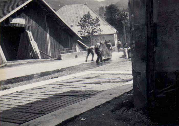 Cette photographie semble anodine, une chaussée est bitumée, celle du Pont d'Enfer devant la scierie de Champfromier. Elle recèle pourtant davantage d'informations, et d'abord la date, le 25 juin 1937, mentionnée au dos. Rappelons nous que le tram avait cessé son usage en mai de la même année et que l'automobile allait donc prendre le relai pour les déplacements dans la vallée de la Valserine. Le pont du tram, qui se trouvait d'ailleurs à côté, ayant perdu sa fonction allait devenir le pont piéton que l'on connaît aujourd'hui. Voitures, roues à pneumatiques, le confort nécessitait donc un revêtement bitumé pour nos principales voies de communications empierrées.