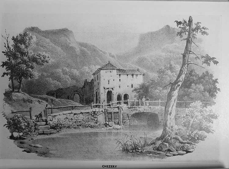 On a des doutes sur les mentions. Notons d'abord que cette gravure semble, comme bien souvent, avoir été réalisée postérieurement à un voyage sur place où avait été pris un croquis à la hâte sur un carnet. Cette représentation est si romantique qu'on peut se demander s'il n'y a pas une erreur dans la localité... De nul endroit de l'emplacement connu de l'ancienne abbaye de Chézery, on n'observe un tel décrochement montagneux en arrière-plan. Par ailleurs aucun toit en tuiles n'est signalé dans les inventaires du XVIIIe siècle (tous ceux mentionnés sont en tavaillons). Ce pourrait alors être une grange isolée, mais il n'en est pas connue non plus avec des étages, de si hautes entrées, et d'imposantes ruines attenantes...