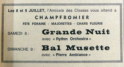 Dans les premiers jours de juillet 1972, toute la population de Champfromier savait qu'un corso-fleuri (3 chars) allait permettre de faire la fête. Mais pour ceux des village voisins, l'annonce fut discrète, ainsi qu'on peut le voir avec la publicité passée par les organisateurs dans La Tribune Républicaine, l'un des organes de presse locaux (un hebdomadaire), où il faut bien lire les petites lettres pour s'apercevoir, qu'en plus des bals, il y aura une innovation spectaculaire : des chars fleuris !