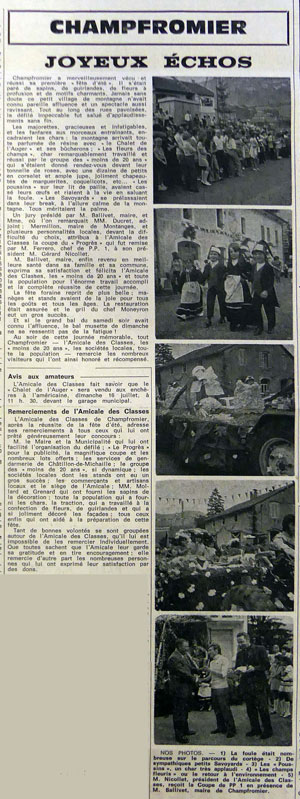 Un jury présidé par M. Ballivet, maire, et Mme, où l’on remarquait MM. Ducret, adjoint ; Mermillon, maire de Montanges, et plusieurs personnalités locales, devant la difficulté du choix, attribua à l’Amicale des Classes la coupe du « Progrès » qui fut remise par M. Ferrero, chef de P.P. 1, à son président M. Gérard Nicollet.