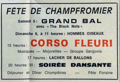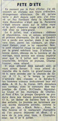 Il vous attend déjà samedi soir, si vous aimez danser. Il vous attend dimanche dès le matin. La grand’messe de 10 h. sera animée par la chorale de Giron. À 11 h., si le temps le permet (l’Amicale des classes a la baraka !), les hommes oiseaux exécuteront leur vol delta. À 15 h., le Corso 1975 déroulera son cortège, avec le concours des majorettes de Culoz, St-Claude, Montréal-La Cluse et les musiques de Challex et Pont d’Ain. Le groupe Gergovia se produira dans ses danses auvergnates. Vers 17 h. un lâcher de ballons fera la joie des enfants. La journée se terminera par une soirée dansante animée, comme la veille, par les « Black Nots ». Avec la fête foraine et le restaurant champêtre où l’on pourra déjeuner et dîner, il y aura de la joie pour tous, à Champfromier, les 5 et 6 juillet."