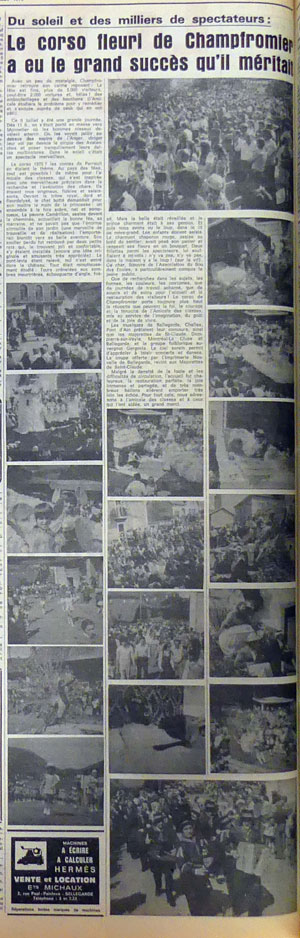 Dans la même édition de l'hebdomadaire on relève un autre article où l'on relate le violent orage du 27 juin avec les eaux qui traversèrent la maison d'Henri Ducret au Bordaz, on veut croire que le beau temps sera de la partie pour les animations et le défilé des chars, cette année avec pour thème principal, celui des contes de Perrault (5 chars, et un sixième pour le Paon).
