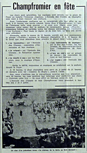 Nous félicitons et remercions sans réserve l’Amicale des Classes de Champfromier qui a su, pour la sixième année, organiser et animer des spectacles originaux et magnifiques. Nos félicitations aussi à la Compagnie des pompiers, au sou des Écoles, et à quelques dames, qui ont réussi trois chars superbes.