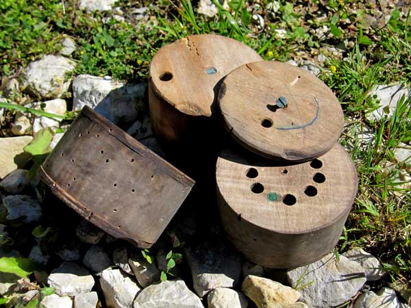 Parmi les précieux objets anciens (de jardinage, de menuisier, de cardeur, de loisirs, etc.), ces trois cylindres vermoulus qui comportent de chaque côté un plateau tournant (dévissé sur le cylindre de droite, photo ci-dessous), plateaux perforé l'un d'un trou situé à proximité du contour (comme celui d'en haut sur la photo), et l'autre plus vers l'intérieur (comme sur la face vue ci-dessous à droite). Ces deux trous des plateaux donnent chacun accès à une dizaine de trous percés dans le cylindre, l'un étant bouché. Une encoche sur le côté du plateau permet de le faire tourner facilement avec le pouce. Sur le côté du cylindre on observe deux petites encoches qui, lorsqu'elles sont alignées, permettent que le couvercle tournant soit en position fermée (en face du trou bouché)...