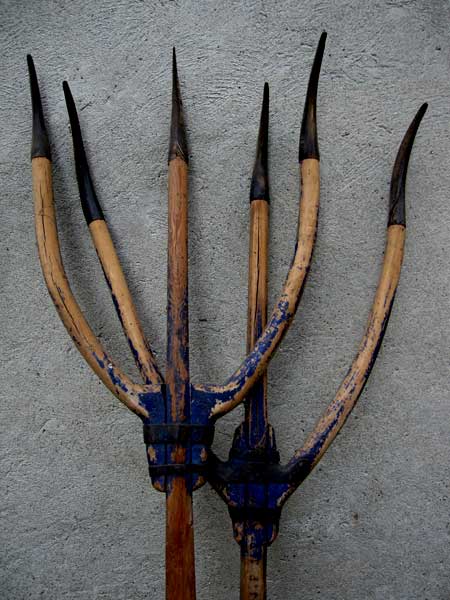 Après la bête à deux cornes (Devinette 27), voici la fourche à trois cornes, plus précisément à trois "cornons" ! Ces fourches traditionnelles portant souvent les initiales du propriétaire gravées à la jonctions des 3 cornes.