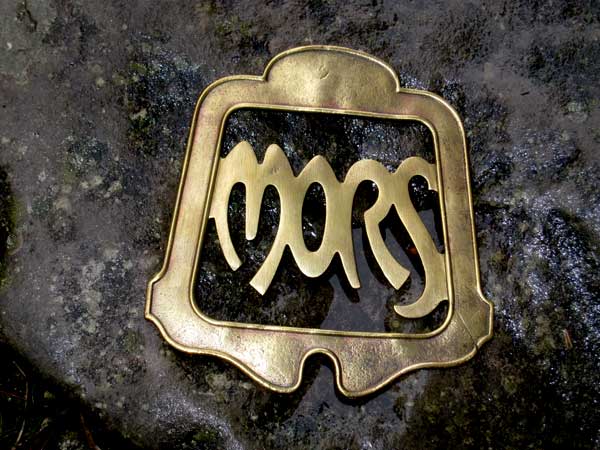 B) La plaque mentionne le nom de "MORS", du nom de l'un des pionniers de l'industrie automobile française. Cet emblème de la marque se trouvait placé à l'avant de la voiture, sur les ailettes de refroidissement du radiateur de la voiture, lui aussi totalement encadré du même laiton lustré pour le plus bel effet.... Les MORS ont remporté en 1899 les courses automobiles de Paris-Saint-Malo et de Bordeaux-Biarritz. MORS fut absorbé par Citroën en 1919.
