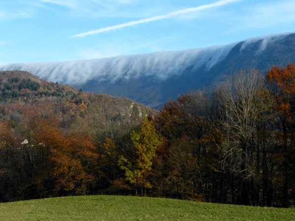Le Jura, entre Suisse et France, un paysage magnifique ! Mais quelles sont ces traînées nuageuses débordantes, retombant de la Montagne du Crêt (en face de Monnetier) ?