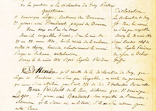 Attendu qu'il résulte de la déclaration du jury que Leger et Bauduret ne sont pas coupables (…), Nous Président de la Cour (...), ordonnons qu’ils soient mis en liberté, s’ils ne sont retenus pour autre cause. Fait à Bourg, au Palais de Justice, dans la Grande salle des audiences, le 31 août 1831 [Signatures].