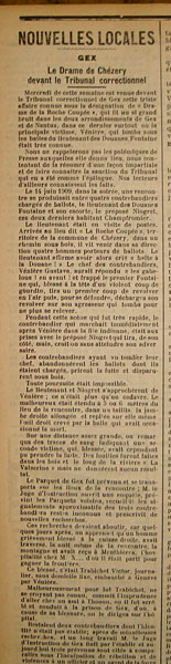 "Gex. Le Drame de Chézery devant le Tribunal correctionnel. Mercredi de cette semaine est venue devant le Tribunal correctionnel de Gex cette triste affaire connue sous la désignation de "Drame de la Roche Coupée", qui fit un si grand bruit dans les deux arrondissements de Gex et de Nantua, dans ce dernier surtout où la principale victime, Vénière, qui tomba sous les balles du lieutenant des Douanes Fontaine était très connue.