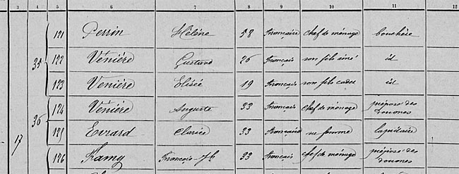 Et le recensement de Champfromier de 1901, où demeurait alors le futur – ou déjà actif – contrebandier, ne faisait évidemment pas mention de son activité : les frères Gustave et Elisée (Elie) Vénière sont tous deux dits bouchers au Pont d'Enfer, avec leur mère (Hélène Perrin, de Belleydoux). Bouchers, ils l'étaient effectivement, leur boucherie se situait, dit-on, au rez-de-chaussée de l'actuel Hôtel du Lavoir (Sylvie Ducret). Précisons qu'en 1901 vivait sous le même toit de cette maison (maison 17 du Pont d'Enfer) une autre famille dont le chef n'était autre qu'un Auguste Vénière, né en 1868 à Echallon (fils de Joseph Marie, et vraisemblable cousin de Gustave), de son métier, préposé des douanes ! Dans le village, on dit encore aujourd'hui que Gustave n'avait donc aucune difficulté pour savoir où se trouvaient les douaniers ! Peu avant l'affaire Vénière, au recensement de 1906, la famille du douanier Vénière demeurait encore au Pont d'Enfer, tandis que Gustave et sa mère avaient déménagé pour le quartier voisin de Champfromier-le-haut, tous deux étant dits sans profession...