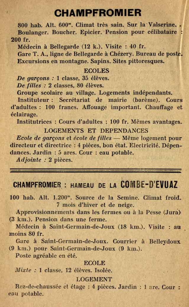 Recherche instituteurs et institutrices pour Champfromier, chef lieu et Combe d'Evuaz, c'est ce qu'exprimait l'Annuaire des postes d'institutrices et d'instituteurs publics du département de l'Ain en 1923. Dans un cas on bénéficie du secrétariat de mairie et d'un affouage important, dans l'autre cas d'une classe à 12 élèves, en un poste agréable l'été...