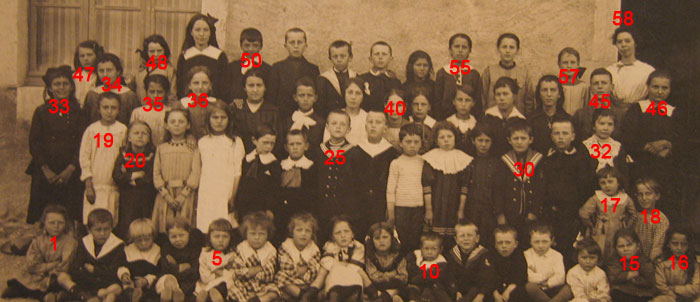 Cette photo a été prise derrière l'école, dans la cour de récréation. Au premier rang, on compte 18 tout petit enfants (16 assis par terre, et 2 debout), et au total 57 enfants scolarisés ! Et il en manque : par exemple Odette Nicollet n'est pas sur la photo, alors que ses deux frères plus jeune et plus vieux, sont scolarisés et présents. Curieusement c'est parmi les plus grands que l'identification a été la plus difficile, probablement, comme pour Denise Coutier, parce que certains de ces enfants n'étaient pas originaires de Champfromier, mais venus avec leurs parents pour les travaux de construction de la voie du tram.
