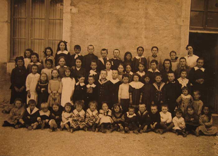 La photo a été prise en été. Yvonne Coutier se souvient que, quelques années plus tard, l'hiver, les enfants n'avaient toujours pas encore de bottes, mais des brodequins ou des galoches, mis avec des chaussettes tricotées. Et la maitresse les grondait s'ils faisaient du bruit en classe en tapant leurs galoches par terre pour faire partir la neige... En rentrant à la maison on posait ses pieds nus sur une brique chauffée. Mais chez eux, comme il y avait plus d'enfants que de briques chaudes, les autres se réchauffaient les pieds sur le couvercle en fonte de la marmite à eau chaude pour les vaches, retourné et posé par terre, couvercle sur lequel on posait ses pieds bien à plat, si toutefois ce n'était pas trop chaud...