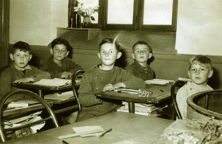 De gauche à droite, les 5 écoliers sont : 1) Etienne PROST ; 2) Charles TODESCHINI (environ 8 ans) ; 3) Michel VALLET ; 4) Gérard VUILLERMOZ ; 5) Christian VALLET.