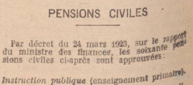 Dans la rubrique « Vœu du fonctionnaire », Marie Eulalie fait noter par le nouvel Inspecteur de Trévoux : « Je désire ma retraite le plus tôt possible. », souhait pressant qu’elle réitère par courrier le 27 novembre 1923. Ce dernier vœu, après 33 ans passés en Dombes dont 27 à Savigneux, est exaucé. Elle a 56 ans, mais elle est épuisée. La voici au Journal Officiel de la République Française du 29 mars 1924, sa pension civile lui étant accordée par le Ministre des Finances de Raymond POINCARE.