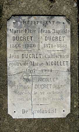 Il s'agit en effet de la tombe de Jean Ducret-Chevron (CI-4920), chercheur d'or parti en Californie du temps de la Ruée vers l'or. L'abbé Genolin a raconté son histoire, avec toutefois quelques arrangements (une seule épouse, fortune partagée avec les malheureux) [Histoire de Champfromier, pages 255-256], mais une chose est certaine, Jean Ducret revint à Champfromier, fortune faite !