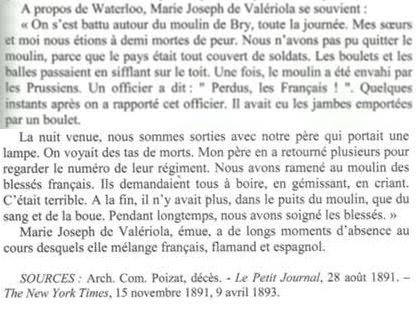 Notons que le couple Carpant-Thirionet fut témoin de la bataille de Waterloo au moulin de BRY, ainsi que leurs enfants, et en particulier Marie-Joseph CARPANT, enfant en 1815 (future épouse De Valeriola, parents de Thérèse De Valeriola, épouse en secondes noces de Luc-Marie Ducret) ; elle fut interviewée peu avant sa mort par le New York Times pour témoigner de la bataille du Moulin de Bry et évoquer leur rencontre avec Napoléon, venu observer les lieux depuis leur moulin la veille de la funeste bataille ; puis de la famille donnant, la nuit venue, à boire aux soldats français gémissants... Elle mourut au Poizat, âgée de près de 90 ans, après avoir communiqué ses souvenirs de la Grande Histoire !