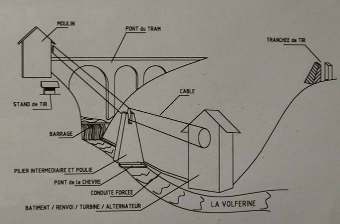 Sur le schéma ci-dessous, on peut voir en haut l’ancien moulin communal (à gauche), avec le pont du tram et ses arches. Le stand de tir (à gauche) a été détruit au profit du bâtiment technique communal actuel (mais la tranchée de tir, à droite, subsiste encore). Les restes du pilier de la télémécanique, ainsi que le "Pont des chèvres" restaurés, sont encore visibles. Le bâtiment et des éléments de l'ancienne turbine sont en ruine.