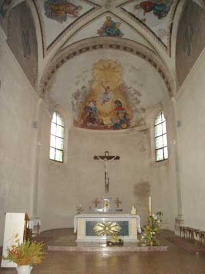 Par rapport à la photo de l'état actuel, manquent le lustre du plafond, la chaire avec son abasson surmontée d'un ange doré musicien (archange Gabriel ?), les panneaux muraux et la corniche faisant le tour du chœur, le grand tableau central et les deux latéraux, et les stalles ainsi que la table de communion (avec son drap blanc brodé derrière), formant séparation entre le chœur et la nef. Manquent aussi (non visible sur la photo) les tableaux du Chemin de Croix. C'est la chaire qui avait le plus de valeur. On ne sait pas ce qu'elle est devenue, pas plus que la belle corniche des panneaux ni le Chemin de Croix. Il n'y a donc plus de chaire mais un nouveau Chemin de Croix, celui actuellement en place, fut racheté ultérieurement, et réalisé avec des émaux dans le Midi de la France.