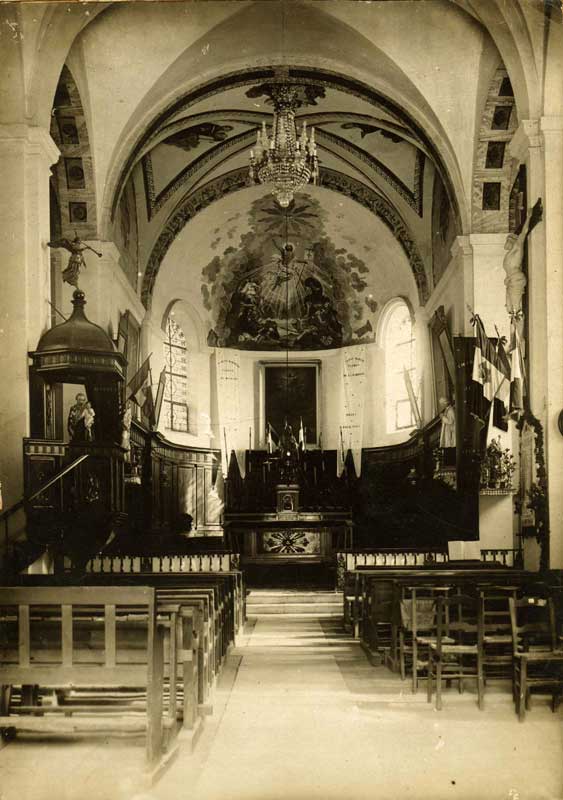 La photographie aux boiseries semble avoir été prise à l'occasion d'une cérémonie commémorative de la Première guerre mondiale, probablement l'inauguration de la plaque portant les noms des Morts pour la France (actuellement replacée au fond de l'église, avec additif d'une plaque pour la Seconde guerre). Un devis pour cette plaque avait été reçu par la municipalité en date du 23 décembre 1923. Au-dessus de cette plaque, et en d'autres endroits, on remarque la présence de nombreux drapeaux.
