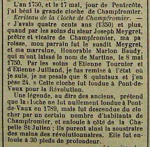 Mais, alors que la publication originale mentionne "Inutile de dire que cette cloche fut fondue à Pont-de-Vaux lors de la Révolution", l'hebdomadaire publie cette étonnante dénégation : "Une légende, au dire des anciens, prétend que la cloche ne fut nullement fondue à Pont-de-Vaux en 1789, mais qu'elle fut descendue du clocher par un certain nombre d'habitants de Champfromier, et enfouie à côté de la Chapelle St-Julien ; ils purent ainsi la soustraire des mains des révolutionnaires. Elle fut enfouie à 30 pieds [environ 10 mètres] de profondeur"...