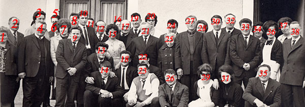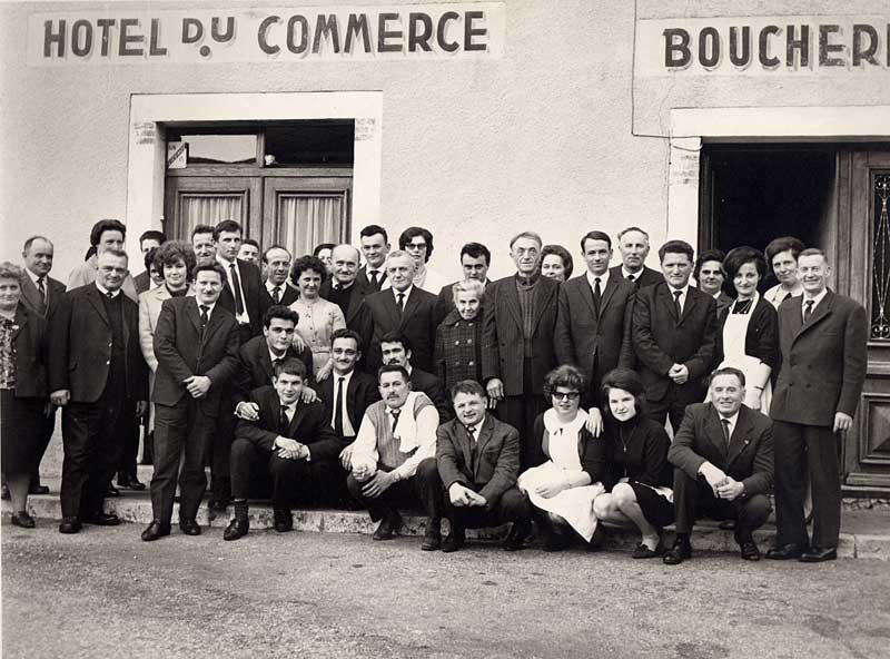 Approximativement de gauche à droite : 1) Elize EFFANTIN, épouse Lhorme (n° 4) ; 2) … JUILLAND, de Montanges ; 3) Fernande DUCRET-TADET, épouse Suro (n° 8) ; 4) Gabriel LHORME (°1915 ; voir n° 1) ; 5) Lucie MUSITELLI (°1925, servante chez les Ducret-Cyrille) ; 6) Henriette MARADAN, dite Hiette, épouse Vuillermoz (n°38) ; 7) Paulette MAFFEI, épouse Richerot (n° 9) ; 8) René SURO (°1925 ; voir n° 3) ; 9) Denis RICHEROT (°1936 ; voir n° 7) ; 10) Michel VALLET (°1945) ; 11) Anselme VALLET (°1925) ; 12) Georges DURAFOUR (de Sous-Roche) ; 13) Georges LHORME (°1946) ; 14) Daniel TOURNIER (°1946, du Bordaz) ; 15) Marie-Thérèse TOURNIER, dite Mimi ; 16) Eliane NICOLLET, épouse Michel Vallet (Absent) ; 17) Louis COLLET (de Montanges) ; 18) Gabriel LHORME (°1936) ; 19) Raymond DUCRET-TADET (°1926, du Potachet) ; 20) Michelle DUCRET-GAUCHET, épouse Ducret (n° 24) ; 21) Fernand DUCRET-LYSET (°1905, scierie Cyrille) ; 22) Marcel GAILLARD (°1946, voir n° 31 épousée en juillet 1966) ; 23) René JUILLAND ; 24) Michel DUCRET-CESAR (voir n° 20, fils de 32 et 28) ; 25) Marguerite DUCRET-HUMBERT, dite Guiguitte (°1895) ; 26) Guy DUCRET-GAUCHET, dit Guigui (°1935) ; 27) Edmond DURAFOUR (°1905) ; 28) Fernande DUCRET, épouse Ducret (n° 32) ; 29) Andrée DUCRET-GAUCHET, dite Dédée (serveuse) ; 30) Henri GENOLIN (°1936, de Monnetier) ; 31) Mireille SALVI (sœur de Rosa) ; 32) Louis DUCRET-GAUCHET, dit Ducret-César (voir n° 28) ; 33) André CHEVRON (°1926, voir n° 34) ; 34) Hélène TOURNIER, épouse Chevron (n° 33) ; 35) Jean VALLET (°1915, voir n° 37) ; 36) Giselle DUCRET-GAUCHET (serveuse) ; 37) Micheline NICOLLET, épouse Vallet (n° 35) ; 38) Aymé VUILLERMOZ (°1926, voir n° 6).