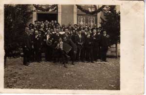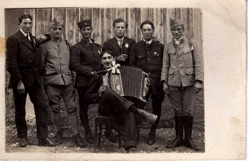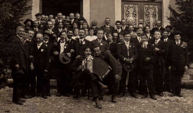 A l'accordéon, Léon Gehrig, fromager (°1896). A sa droite sur la photo, penché, Victor Tournier (°1898). Derrière la tête de ce Victor, se trouve Félix Ducrest (frère d'Eloi), et son épouse Marthe Julliand, la tête penchée vers son mari.