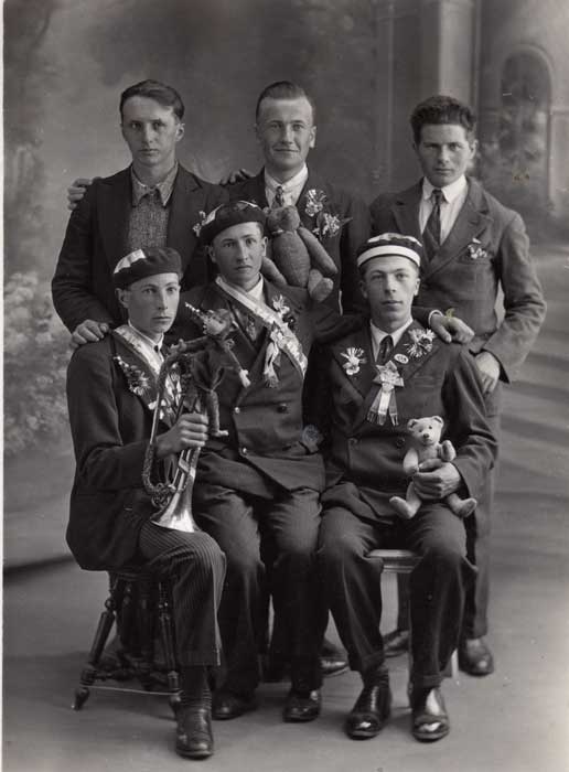 De gauche à droite. Devant : 1) Louis DUCRET-CESAR (°1913) ; 2) Marcel VALLET (°1913), de Communal (ép. Marie-Louise Ducret, de Monnetier) ; 3) Marcel COURBE-MICHOLET (°1913). Derrière : 4) ??? ; 5) ??? ; 6) Henri MARADAN, né vers 1909.