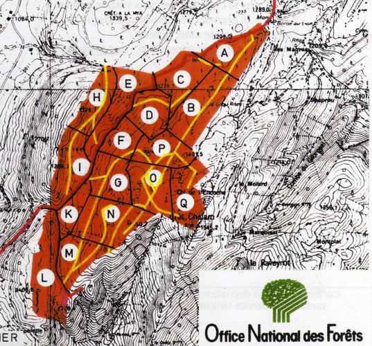 Les documents actuels de l'ONF permettent de situer rapidement la parcelle appartenant à la commune de Montanges, parcelle couramment dite "Forêt de Montanges", même si à l'origine cette parcelle était bien davantage une aire de pâturage que forestière. La parcelle est d'une superficie de 179,17 hectares et couvre des cantons dénommés Magras, le Ramble, Arête du Tamiset, Arête des Ponts, Ramas et Chalame. La forme globale est celle d'un losange de grand axe allant de la Borne aux Lions jusqu'au nord de Sapelette, et de petit axe reliant les sommets du Tamiset et du Crêt de Chalam.