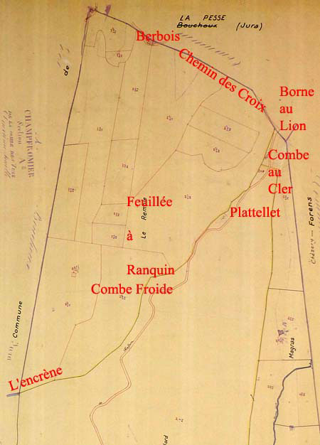 Grossièrement la forme du domaine de Chalam appartenant à la communauté de Montanges est celle d'un losange. Le côté nord-ouest fut délimité en 1733 d'avec le Sr Demermety, y possédant alors une autre vaste montagne (pâturage d'altitude), la Grange du Berbois. La limite nord-ouest se trouvait entre les parcelles A66 et A72 des plans napoléoniens en 1833 (feuille A2). Mais pour faire simple on peut dire que cette limite de l'immense domaine accordé au Montangers (175 hectares environ)ne se trouve généralement qu'à quelques mètres à l'ouest de l'actuel GR9, entre la Borne au Lion et le Bief Brun. Le promeneur à la recherche du passé pourra s'y engager et peut-être retrouver la trace, non des "limites" (probables pieux en bois) mais de trois croix alors portées sur des rochers et servant de délimitation... Près de trois siècle après, la lecture de l'acte notarié nous fera retrouver des noms de combes oubliées (Combe au Cler, Combe Grillu, Combe Froide et autre Feuillé à Ranquin). Et si vous voulez rêver, imaginez-vous, le 15 juin 1733, croisant en ces lieux les notables locaux de l'époque, Me Jean-Claude Brunet, avocat en Parlement, seigneur des maisons fortes d’Oyonnaz et de Marchon, sindic général du tiers état de la province de Bugey, juge des terres de Dortand et d’Arbent, Me Claude Demermety, avocat en Parlement résidant à Dijon, son beau-frère, et autres Me Maurier, notaire de Montanges...