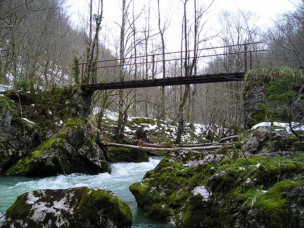 Plus tard ces rudimentaires passerelles furent remplacées par de vraies planches posées en travers sur deux câbles d’acier tendus entre les deux rives, et deux autres câbles furent tendus plus haut pour servir de main courante.