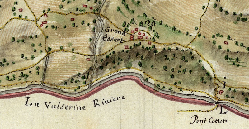 Le même Pierre Cotton susdit m’a encore déclaré que les employés de France le menacent de jeter le pont susdit dans la rivière, et ne prétendent pas que le même aille pâturer sur ses fonds qu’il a en France, à moins que son bétail n’y reste entièrement, ne voulant pas de même qu’il tire en Savoye son bois pour son chauffage, qu’il (a) aussi sur France, et même ni beurre ni œufs, sans qu’il en paye des droits, qui ne sait en quoi ils consistent (…)" [AST (Turin), Duche de Savoye, inv. 3, maz. 3, plan topog. fasc. n. 10].