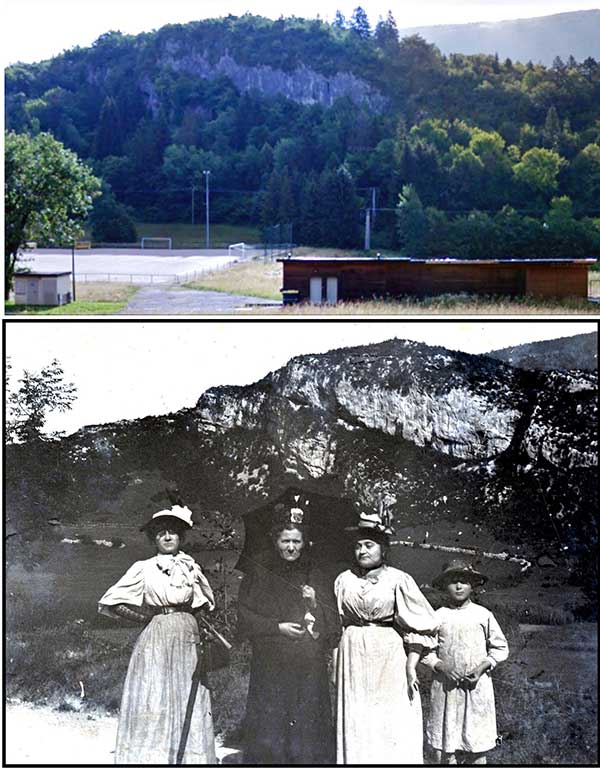 La photo sur plaque est attribuée à Marius Chapuis (vers 1905 ?). La première femme (au corsage, jupe et chapeau caractéristique) se retrouve en de nombreux clichés (mairie, forge), de même que la seconde. La troisième femme est Madame Marie Neyroud, née Julliand [CI-6636]. L'enfant figure aussi sur plusieurs photos avec d'autres habitants de Champfromier. La comparaison des photos à un siècle d'écart montre, ici comme en bien d'autres endroits, l'emprise forestière. La photo sur plaque est prise depuis la route. Dans le fond, des murets de pierre délimitent des enclos.