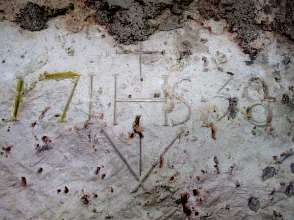 Une croix se trouve au-dessus du sigle IHS (Jésus Sauveur des Hommes). En dessous, sont figurés les trois clous de Jésus mort sur la croix (un pour chaque main et un pour les deux pieds). On les voit souvent placés comme ici et associés à IHS. La sculpture est élégante et réalisée avec un souci du détail et de la finition, un clou de ce linteau présente encore une sculpture en forme de flèche bien marquée à une extrémité.