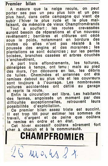 Un article de la presse locale, retrouvé dans un exemplaire de l'Histoire de Champfromier : l'hiver avait donc marqué les esprits !