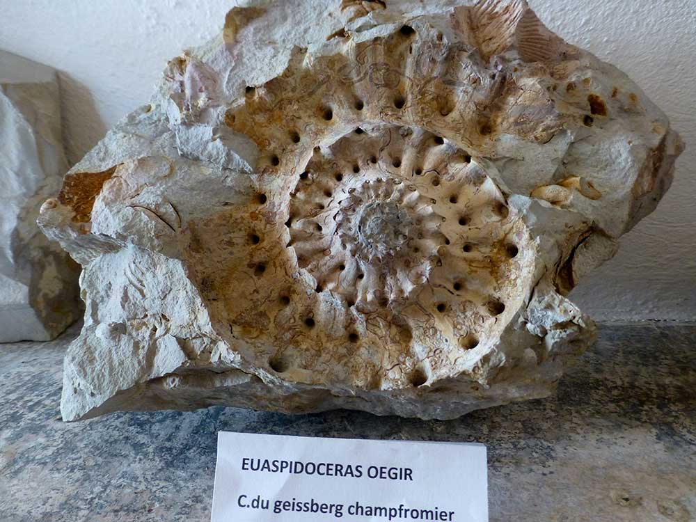 | Ammonite Euaspidoceras oegir. Présentée lors de l'exposition "Escapade dans les couloirs du temps" au Château de Musinens (Bellegarde sur Valserine), du lundi 17 au dimanche 23 mars 2014. Ce fossile avait été découvert au bas d'une falaise de Champfromier, quelques années avant l'exposition. | |