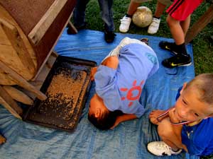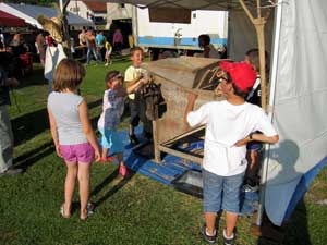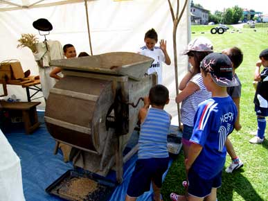 Les espoirs de participation furent très largement dépassés par des nuées d'enfants, footballeurs et autres, qui passèrent une bonne partie de leur temps libre à venir et revenir, avec toujours plus de copains, à qui verserait le blé, ouvrirai la trappe et surtout tournerai la bruyante manivelle ! Et même inlassablement, ramasser par terre le blé et la paille pour les recycler indéfiniment, garçons et filles n'ont jamais manqué ! Certains essayaient même de comprendre "c'est le vent qui fait partir la paille". D'autre, à quatre pattes, voulaient voir d'où venait le grain purifié. Et ne dites pas que les enfants, eux, ne savent pas dire merci, c'est le contraire : "C'est trop bien" est la meilleure des récompenses pour l'équipe qui s'est investi sans compter durant une semaine, à réparer ou consolider bois et ferraille, préparer les explications et le questionnaire et, ce n'est pas le plus facile, trouver du blé en vrac...