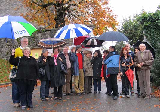 Ce 5 novembre, nous étions donc une vingtaine, dont quelques uns venant de Bellegarde, réunis au Château de Musinens. Jean-François Terraz, profitant d'une bien agréable accalmie de la petite pluie nous a d'abord présenté en extérieur l'histoire locale et les limites territoriales, France, Bourgogne, Savoie, et en particulier le tracé du si particulier Chemin des Espagnols. Puis ce fut la "lecture" de l'architecture de ce "château" avant d'y pénétrer et de découvrir les escaliers intérieurs des murs (2,20 m), le cellier, la salle de la justice, celle dite de la Reine, la chapelle, la salle des coffres et l'escalier au superbe plafond restauré de 1570. Captivés par l'histoire de ce château et la généalogie des branches qui l'occupèrent, deux heures après, Jean et Luce Robin, autres animateurs de "Renaissance du château de Musinens", nous offrirent un agréable pot de l'amitié, où les discussions continuèrent bon train, complétées par un intérêt soutenu aux publications du château. Une collecte a rapporté exactement 40 euros, somme intégralement reversée à l'association qui nous a si aimablement accueillis.