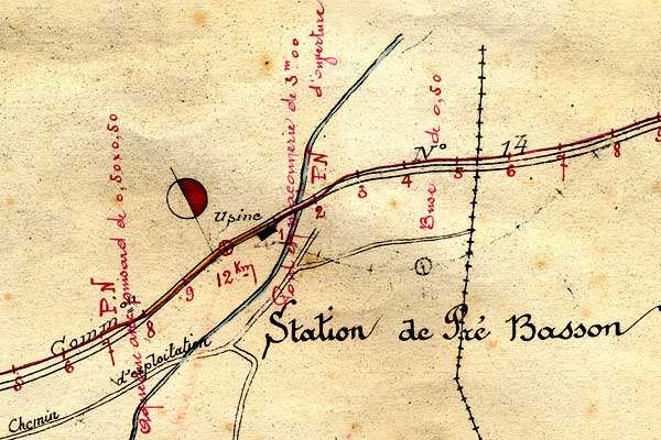 Dès 1907, un argument de vente de l'usine de plâtre était la construction du chemin de fer d'intérêt local de Bellegarde à Chézery, "avec embranchement particulier à l'usine". On voit bien effectivement sur cette feuille de plan manuscrit, au niveau de l'usine (réorienté pour une lecture plus facile des principales mentions), que la voie ferrée (en rouge) change de côté par rapport à la chaussée pour passer au plus près de l'usine. Le tram n'y faisait qu'une simple halte. Y faire une halte, signifiait que le tram ne s'y arrêtait que s'il voyait quelqu'un levant le bras à proximité (ou peut-être un wagon à prendre en charge)... On voit sur le plan qu'un PN (Passage à Niveau) est positionné aux deux endroits où la ligne ferrée traverse et retraverse la chaussée routière (le chemin de grande communication n° 14). Par passage à niveau, il ne faut pas s'imaginer que se trouvaient là des barrières, mais que les rails devenaient en creux en traversant la chaussée, et que les éventuels automobilistes passant par là en étaient prévenus par un panneau sur lequel était inscrit ce simple mot, "ATTENTION" ! En effet, ces rails étaient glissants par temps humide. Enfin, par mégarde ou ennui mécanique, un tram ou un wagon pouvaient se trouver immobilisés sur la chaussée !