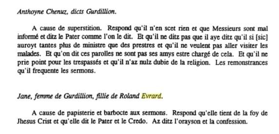 S'il n'est pas certain que la religion soit directement la cause de la peine de Jean Evrard, par contre en 1543 une Jane Evrard [11906], fille de Roland, demeurant à Genève et probable épouse d'Anthoyne Chenuz, dit Gurdillon, est questionnée juste après ledit Gurdillon, du temps du début du Calvinisme à Genève. Mais là, c'est son origine de Champfromier qui n'est pas établie... [Registres du Consistoire de Genève au temps de Calvin. Tome I, 1542-1544, année 1543 (page 116v, numérique 232)].
