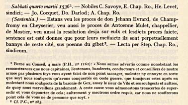 On sait que c'est en 1536 que Calvin est appelé à aider à la réforme de l'église à Genève. Or, cette même année, suite à des procès, un Jean Evrard de Champfromier [CI-11905], portant de le titre de "Dom" et donc religieux (bénédictin ?) semble déjà subir les conséquences du choix de sa religion, ou entrer dans les justificatifs de la Réforme pour cause de comportement dégradé, en étant banni à vie de Genève, sous peine de gibet !