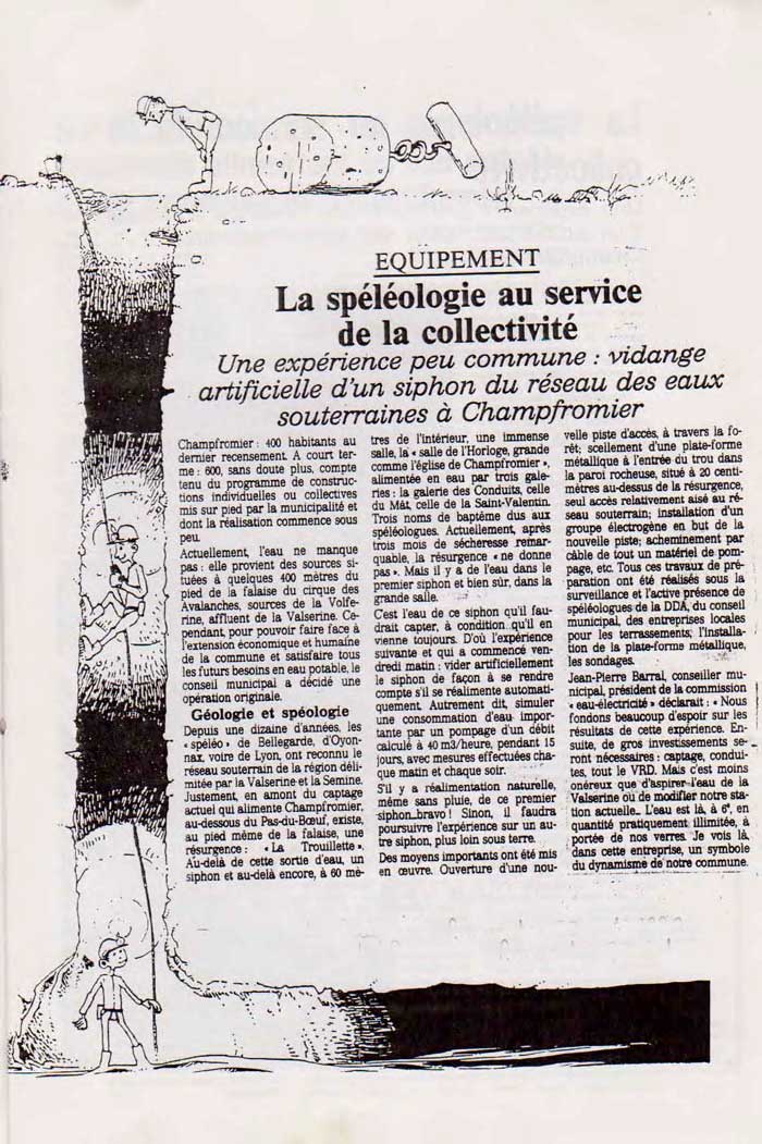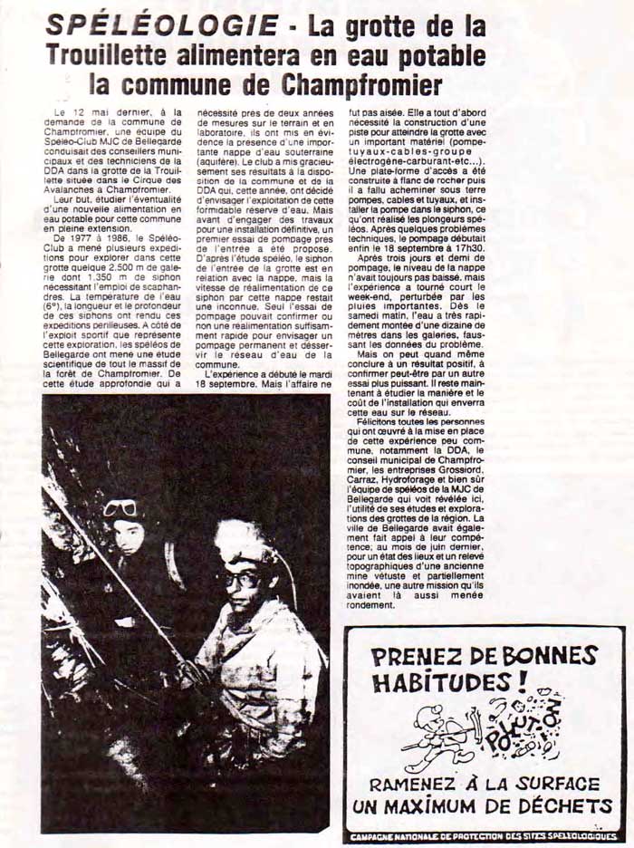 La presse locale n'a pas souvent relaté les activités spéléologiques. Toutefois elle s'en et fait l'écho quand elle fut au service de la collectivité et qu'il fut envisagé, en septembre 1990, de capter de nouvelles masses d'eau disponibles à la Trouillette pour l'alimentation en eau potable de la commune.