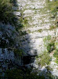 Le méandre de gauche se poursuit par une cheminée conduisant à d’étroites galeries sur joints de strates.
