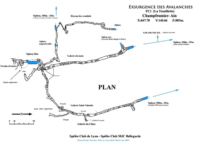 2) La Galerie des Conduits, qui débute par une conduite forcée se relevant progressivement, avec courant d’air. Au bout d’une soixantaine de mètres elle recoupe une diaclase qui menant à un siphon détermine un changement de direction. (180m. -25m. T. Tournier, C. Locatelli). Une remontée au dessus du siphon nous mène à un méandre se scindant en deux parties.